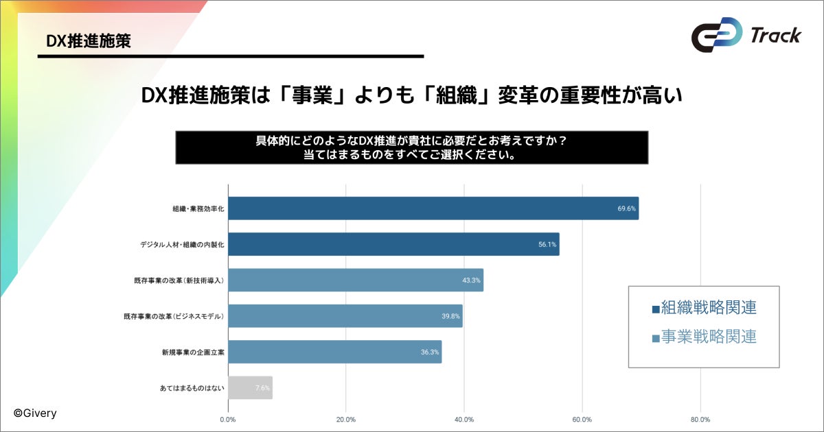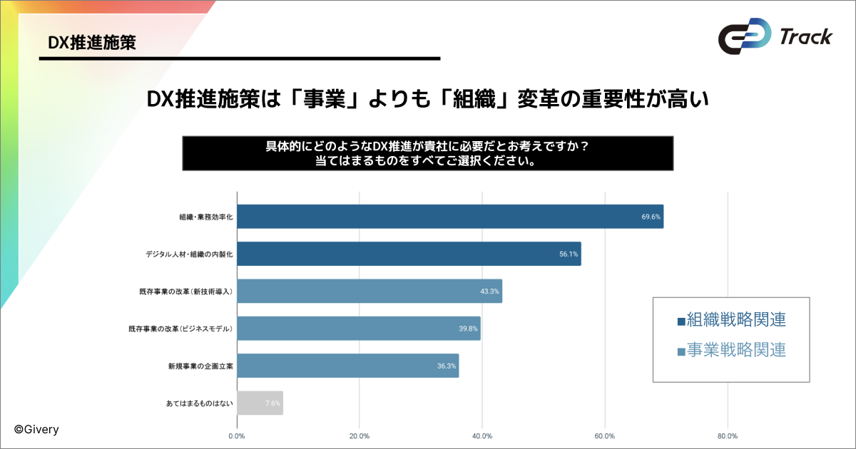 -DX推進の具体的な施策としては「業務生産性の効率化」や「DX推進人材の内製化」が事業戦略や事業改革よりも注目度が高まっている