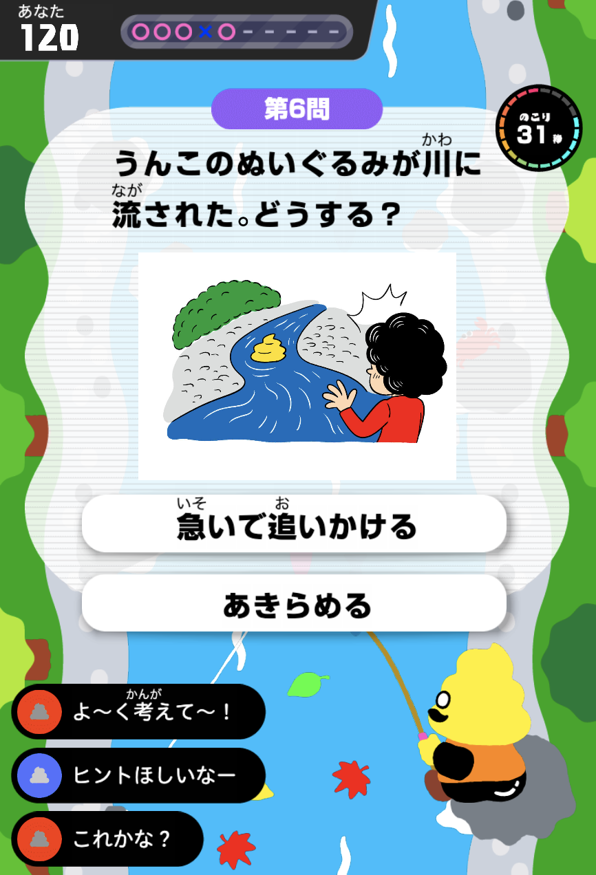 川遊びに出かけるシーンからはじまり、川に持っていく必需品を問います。