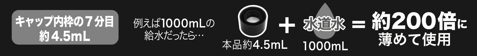 加湿器給水タンクに水を張り、水1Lに対してキャップの内側の7分目(約4.5mL)の割合で本品を混ぜ、約200倍に薄めてご使用いただけます。