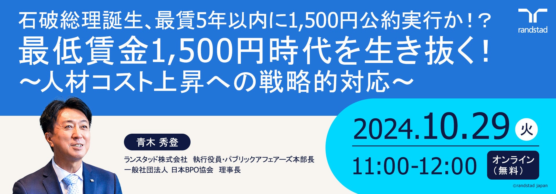 総合人材サービスを提供するランスタッド株式会社(本社:東京都千代田区 代表取締役社長 猿谷哲)は、10月29日に人件費上昇への対応に悩む経営層や人事担当者などを対象にしたウェビナー「最低賃金1,500円時代を生き抜く!~人材コスト上昇への戦略的対応~」を開催いたします。石破自民党総理の誕生、衆議院選挙で注目される最低賃金の上昇に対応し、価格転嫁を実現するための具体的な取り組みや交渉のポイントなど実践的な方法をランスタッド執行役員青木秀登がご説明します。