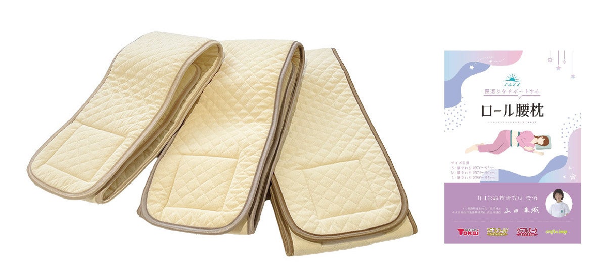 枕の見直しだけでは対応のできない睡眠の悩みを持つお客様に向け、山田朱織枕研究所とアスシアの共同開発で「ロール腰枕」を販売開始しました。