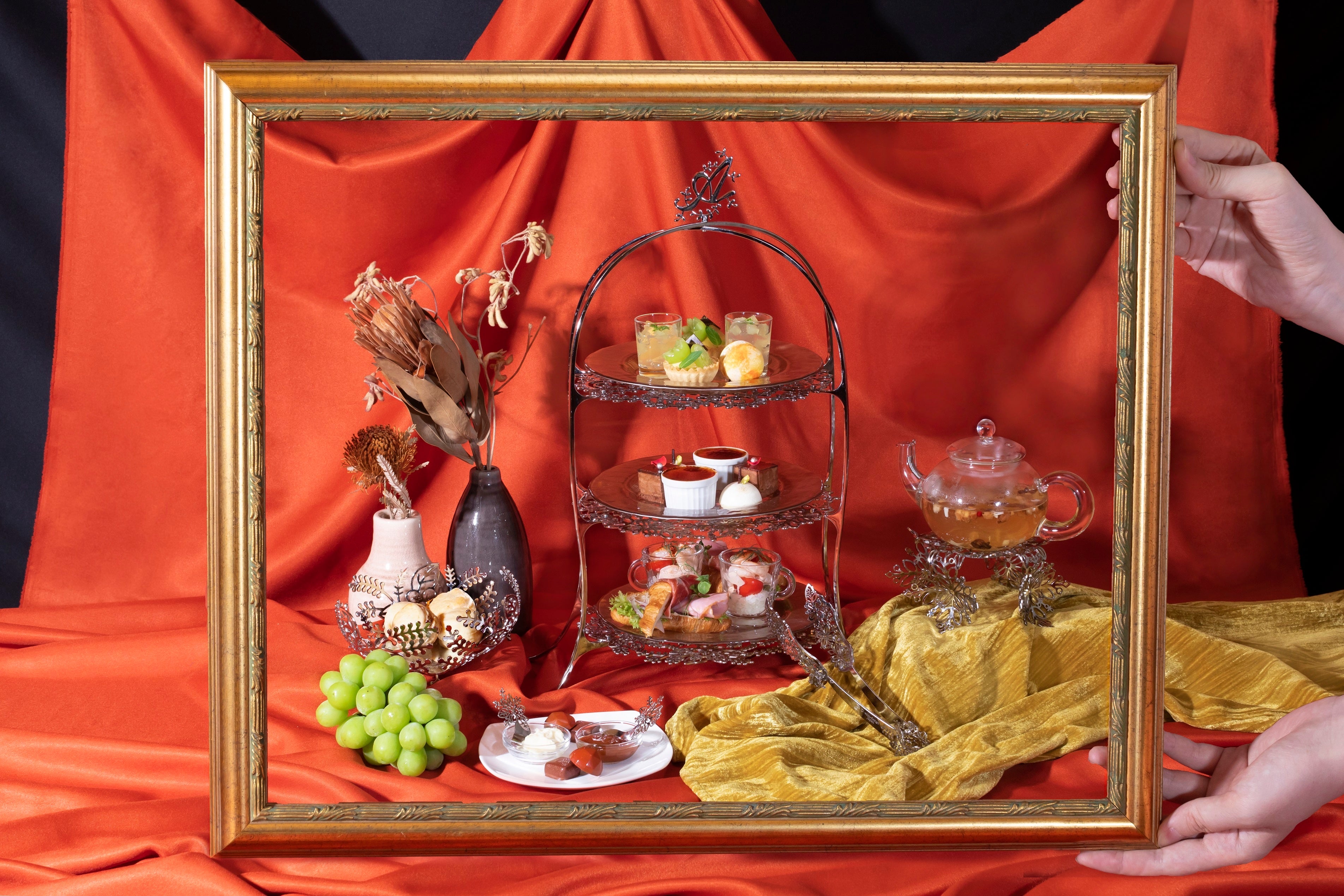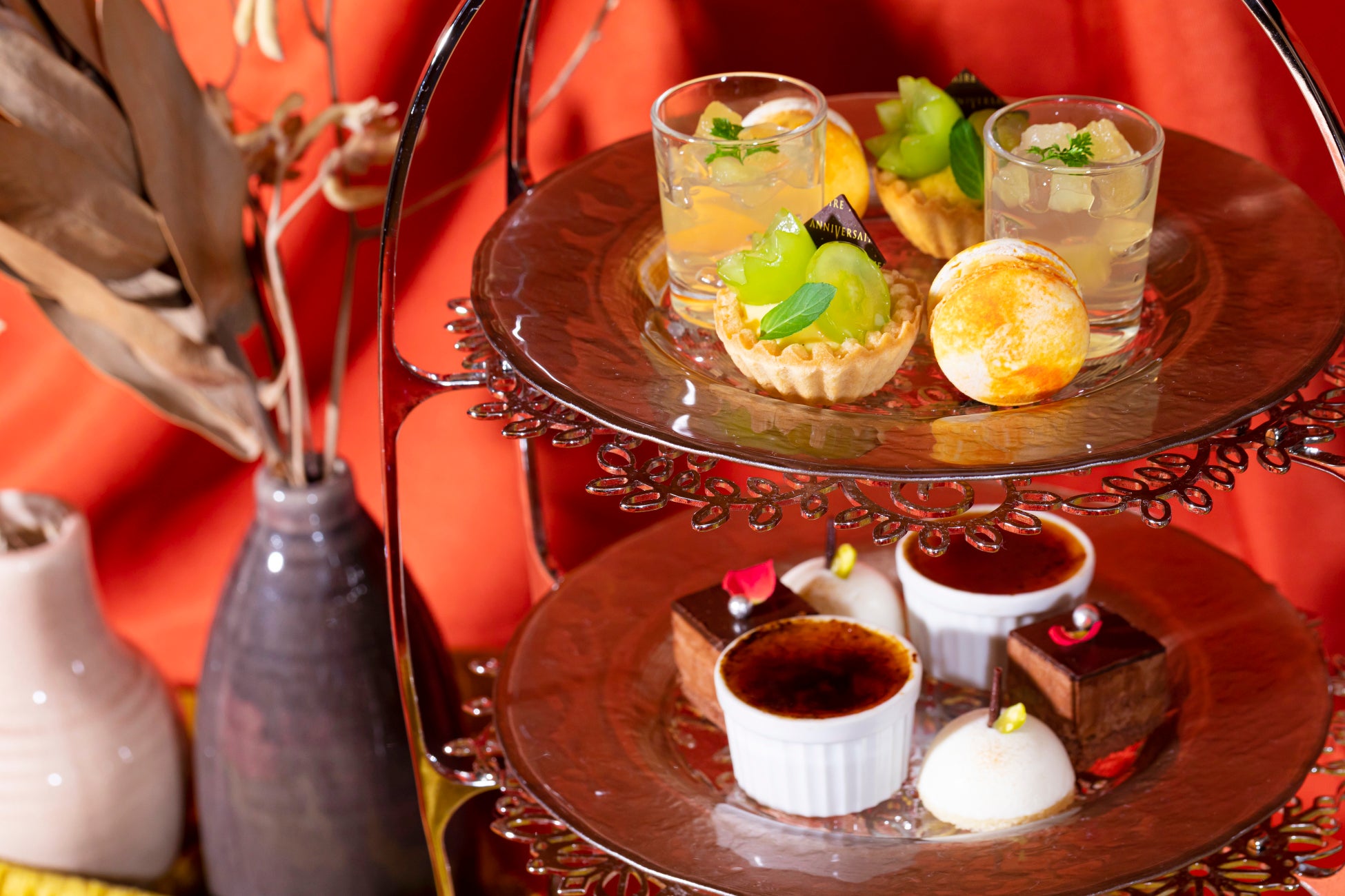 アニヴェルセルカフェ オリジナルのアフタヌーンティースタンドに秋の美しさを表現した色とりどりのデザートとフリーフローのドリンクを心ゆくまでお楽しみくださいませ。