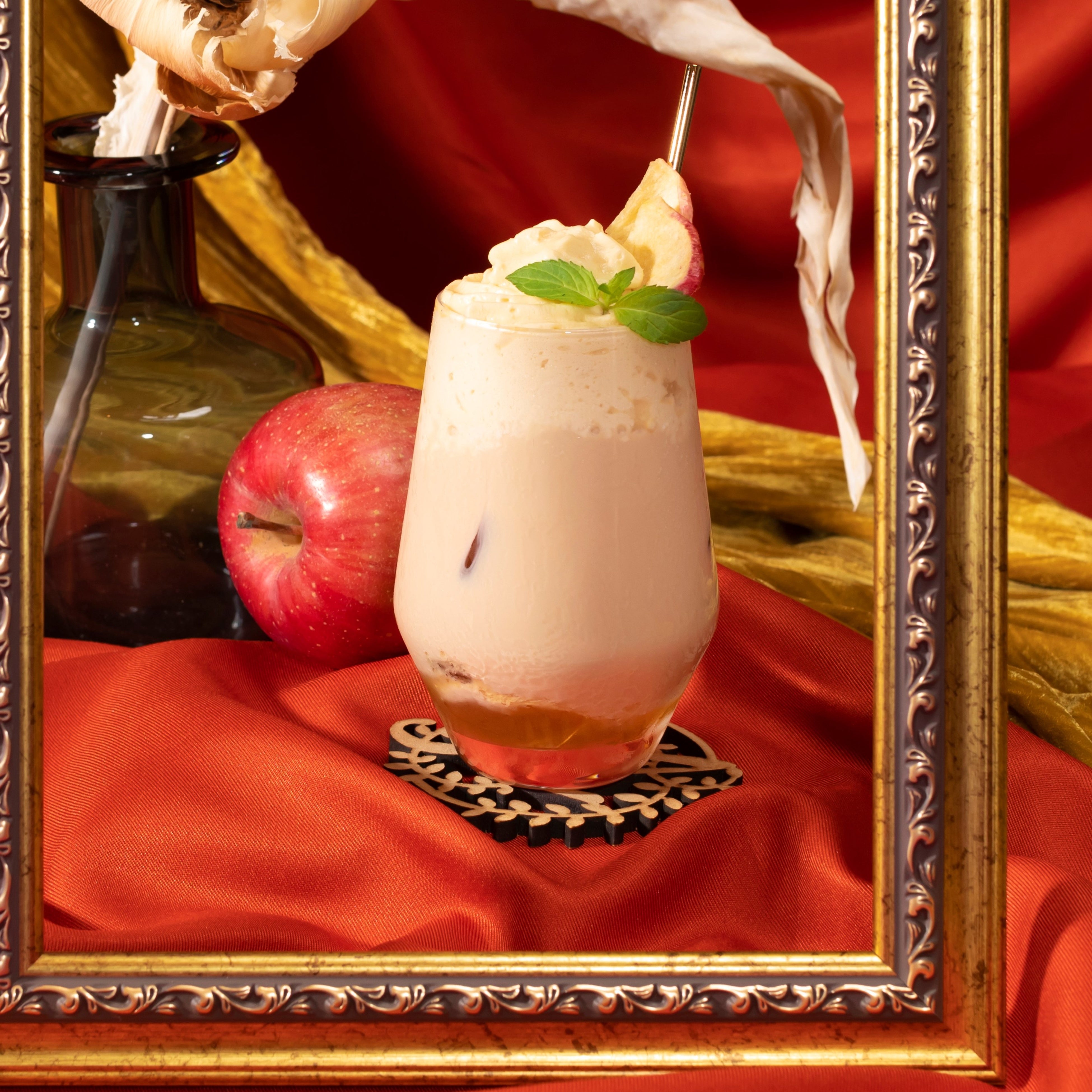 リンゴの優しい甘さとキャラメルエスプーマの相性を活かした秋にぴったりのアイスミルクティーです。