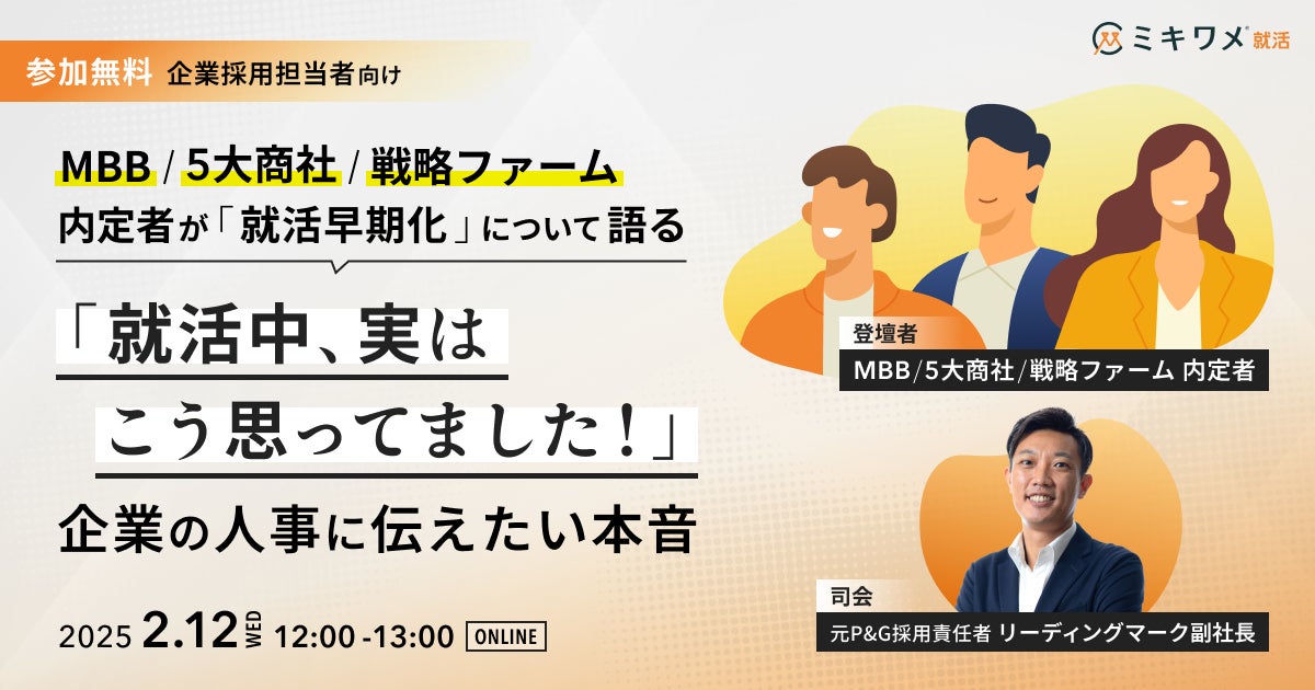 株式会社リーディングマーク(本社:東京都港区、代表取締役社⻑:飯⽥ 悠司)は、旧帝大・早慶層を対象とした早期採用を目指す企業向けに、5大商社や外資戦略ファーム、日系大手メーカーに内定した25卒、26卒の学生をお招きし、採用戦略セミナー「『就活中、実はこう思っていました!』企業の人事に伝えたい本音」を2025年2月12日(水)12:00-13:00に開催いたします。