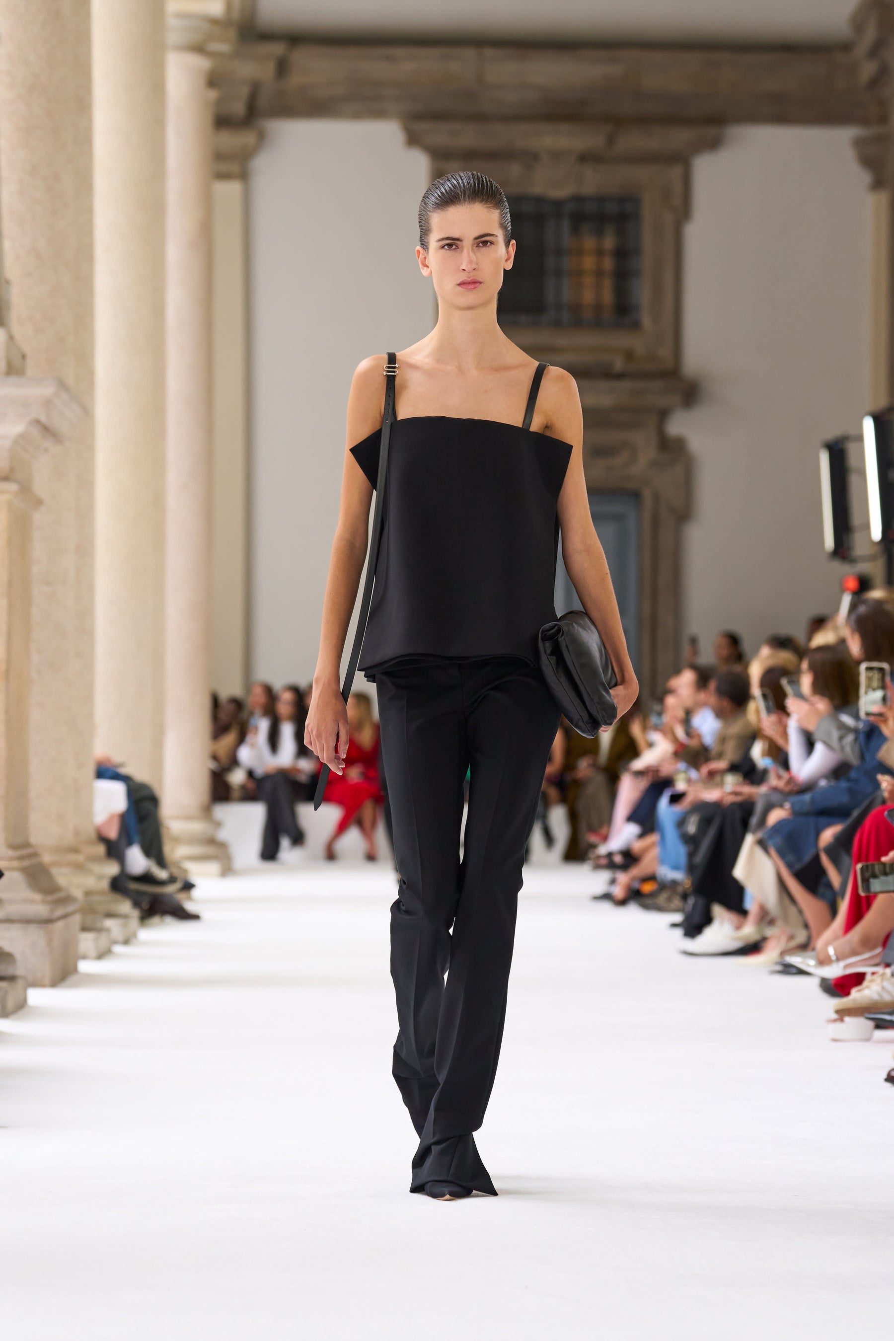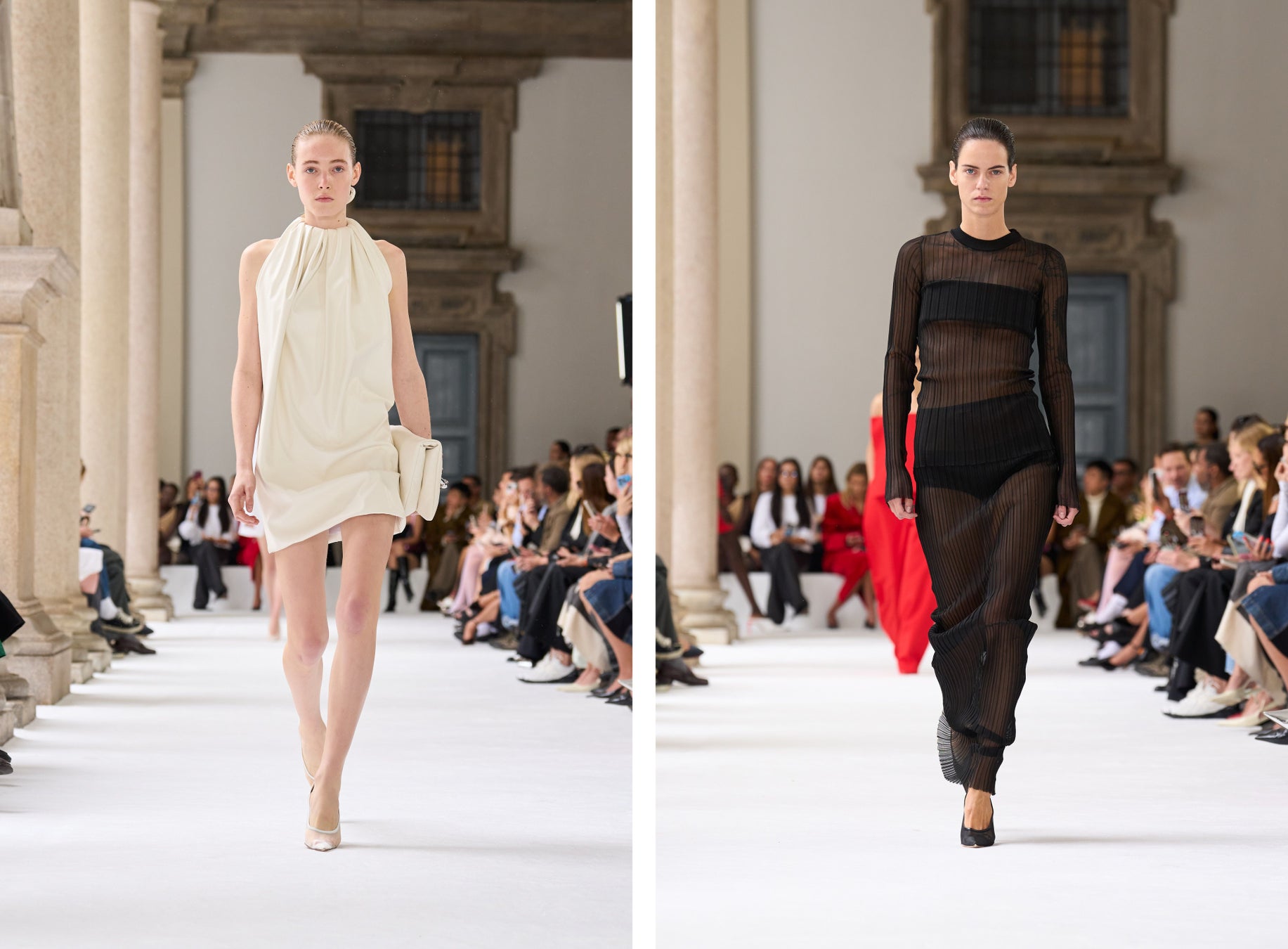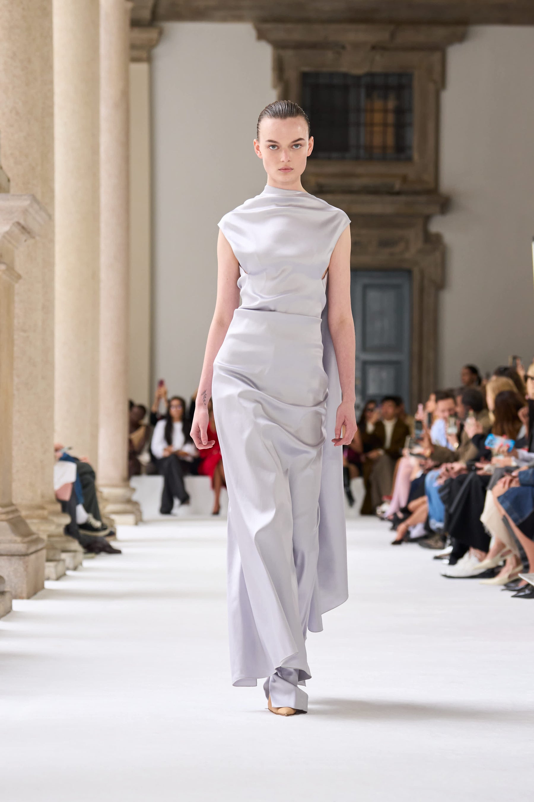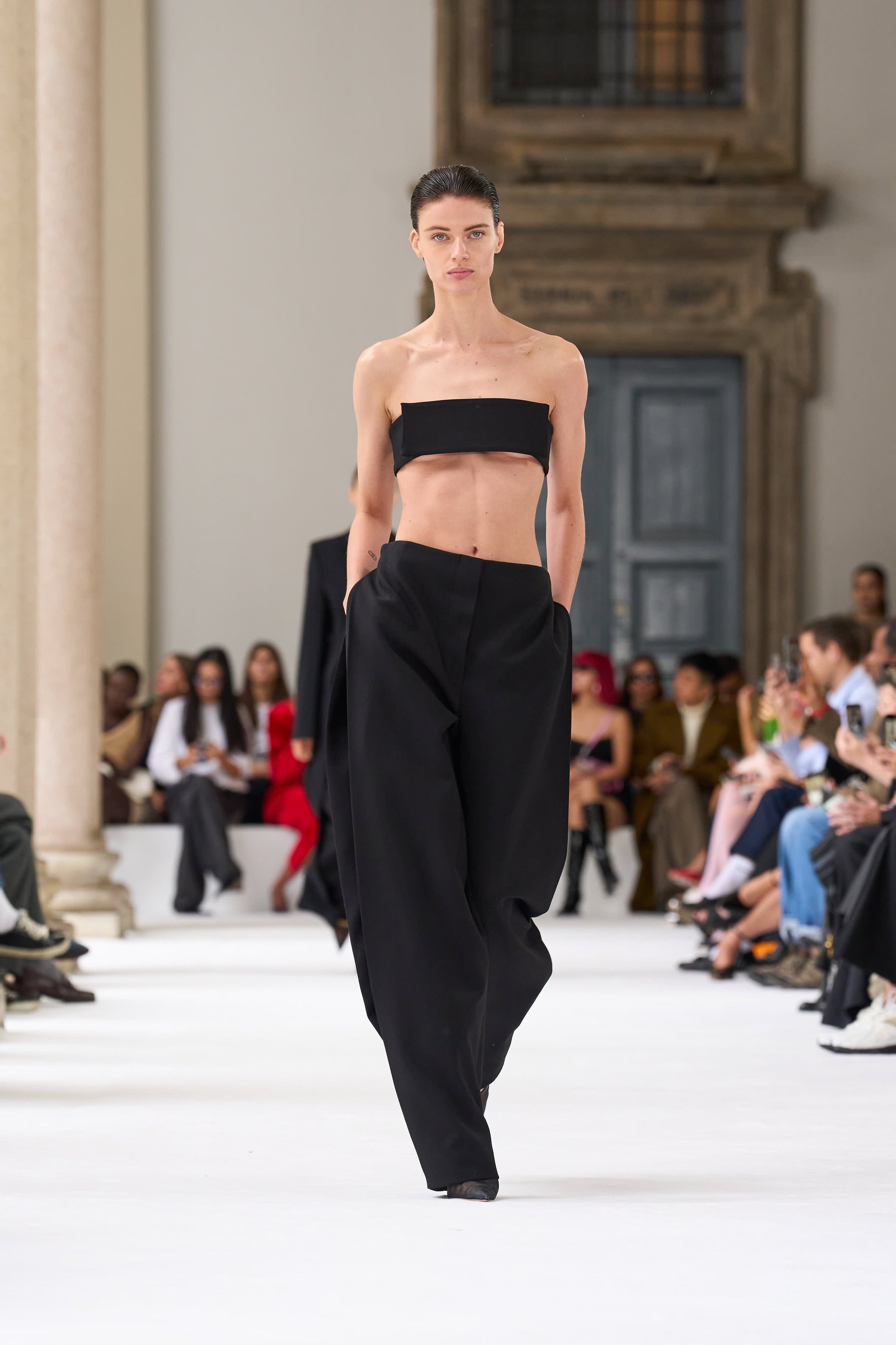 ブレラ美術館のアーチ型のアルコーブを舞台に発表されたこのコレクションは、イタリアの重厚な工芸の伝統と響き合い、個性豊かな美を引き立てます。この場所は、芸術や工芸の頂点を目指す者たちにとっての聖地。100周年記念の彫刻が並ぶアリーナからは、真っ白なキャットウォークが広がり、マキシマルとミニマルが交差する中で、スポーツマックスの物語が鮮やかに展開されます。
