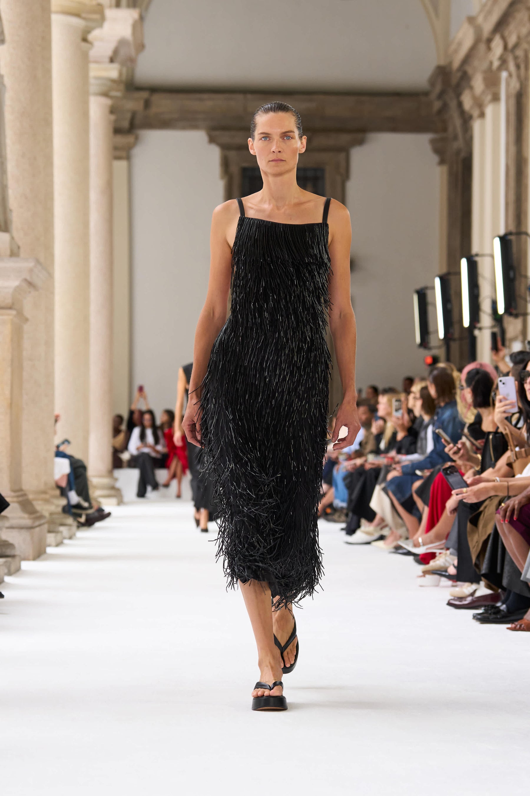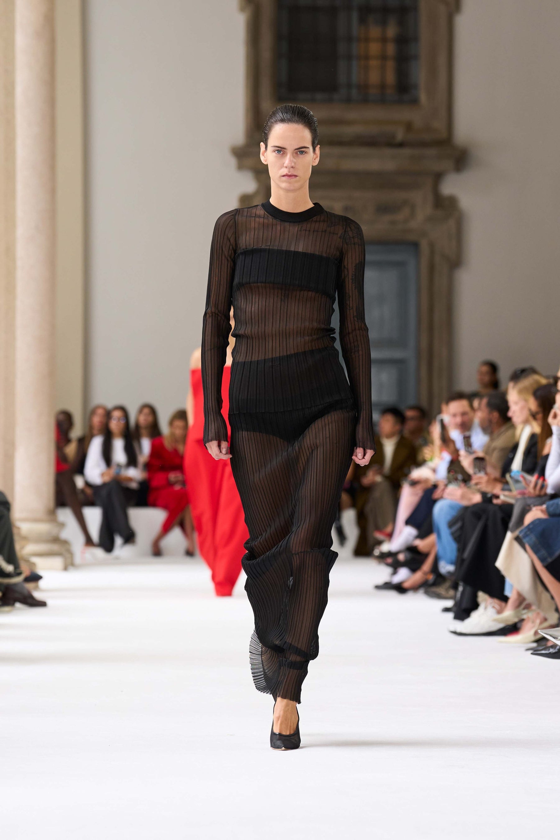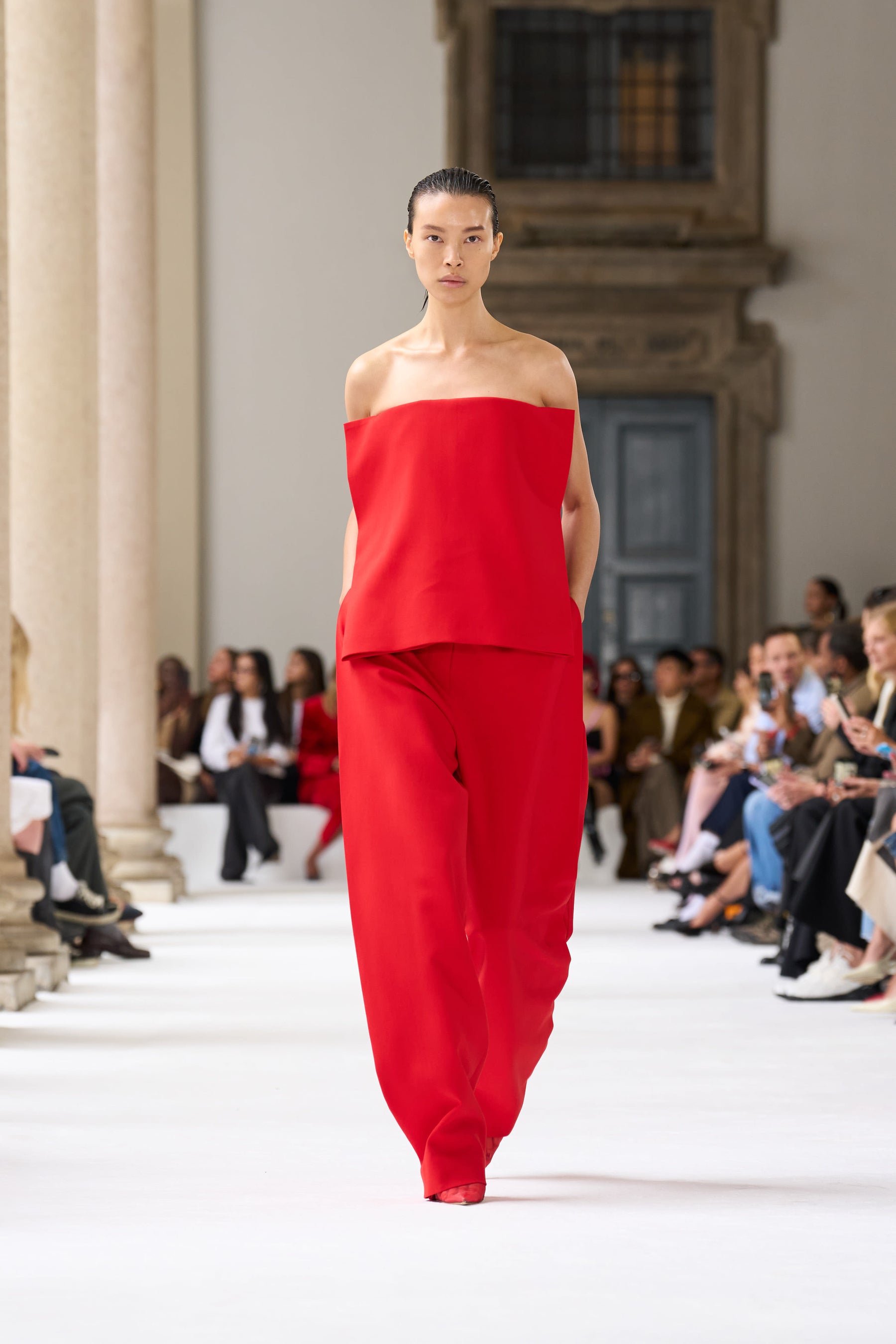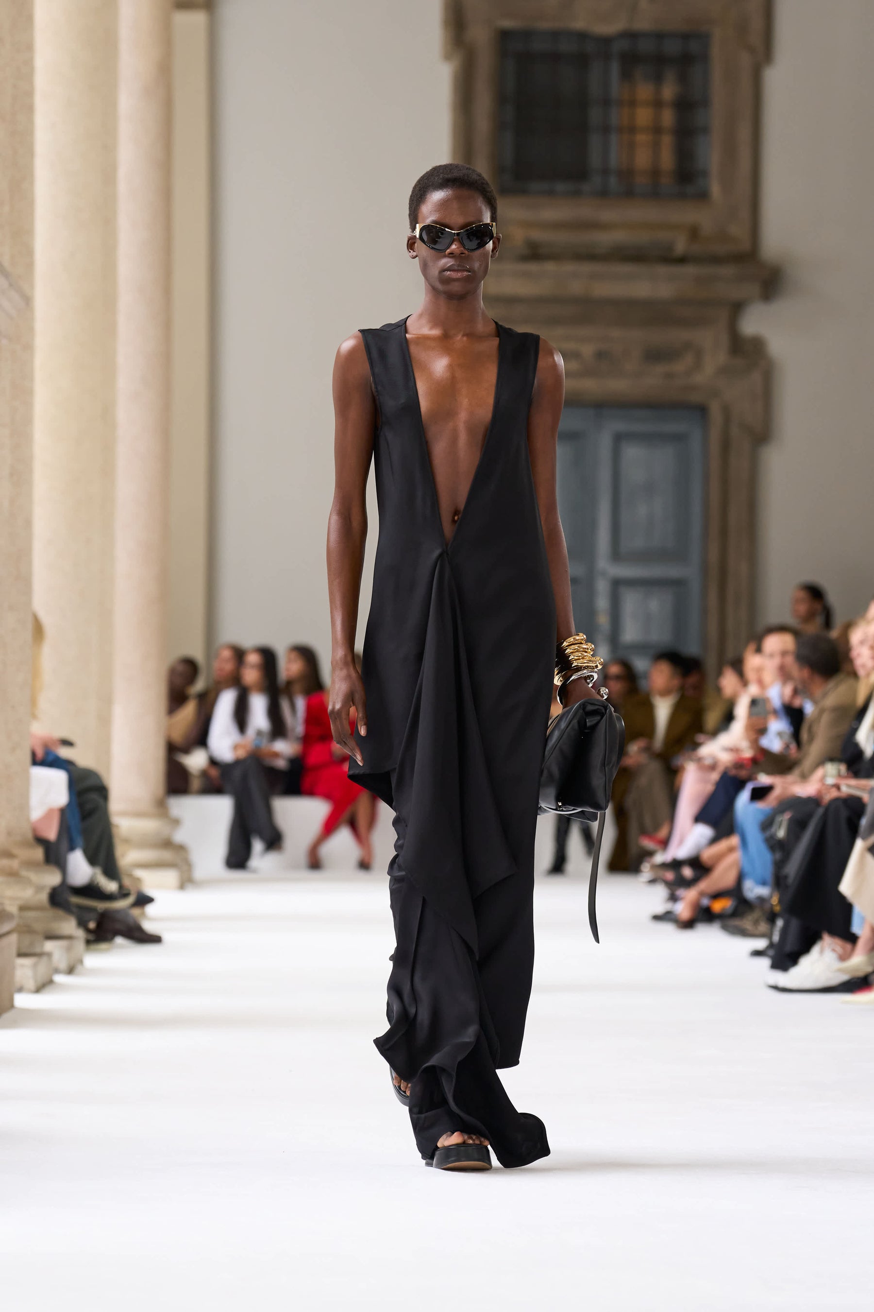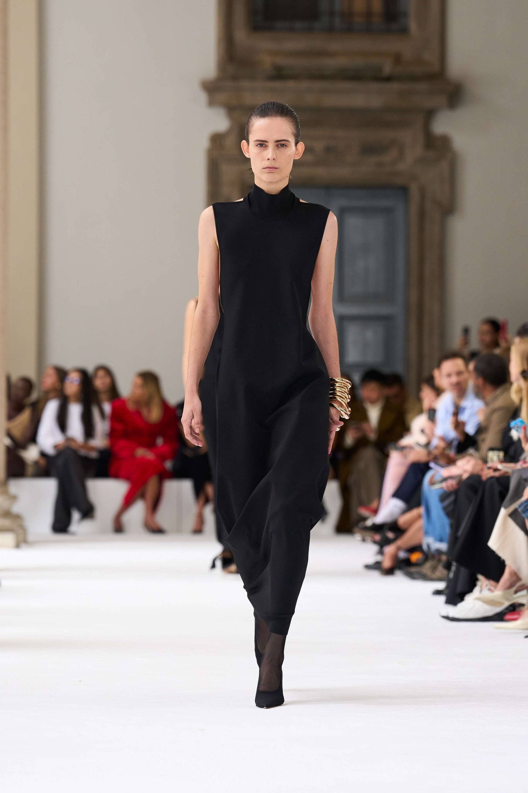 ブレラ美術館のアーチ型のアルコーブを舞台に発表されたこのコレクションは、イタリアの重厚な工芸の伝統と響き合い、個性豊かな美を引き立てます。この場所は、芸術や工芸の頂点を目指す者たちにとっての聖地。100周年記念の彫刻が並ぶアリーナからは、真っ白なキャットウォークが広がり、マキシマルとミニマルが交差する中で、スポーツマックスの物語が鮮やかに展開されます。