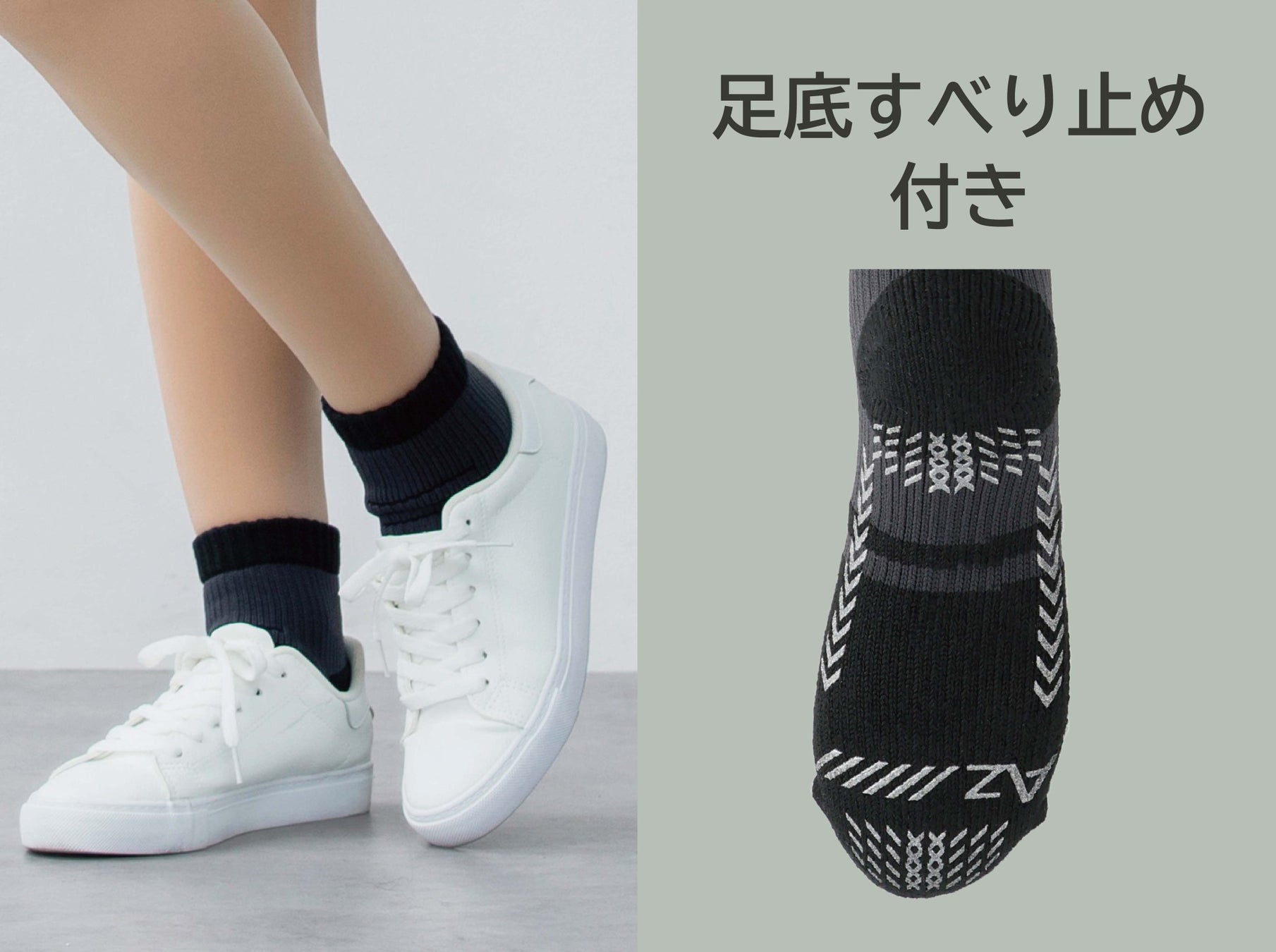 くるぶし上まで包み込み、足首をサポートするスニーカー丈のソックス。トレンカなどとのコーディネートもおすすめです。分厚いクッションパイル生地で足にかかる衝撃を和らげます。足の甲部分は通気性の良いメッシュ仕様。芝の上で踏ん張りがきくよう足底にはすべり止め付きです。