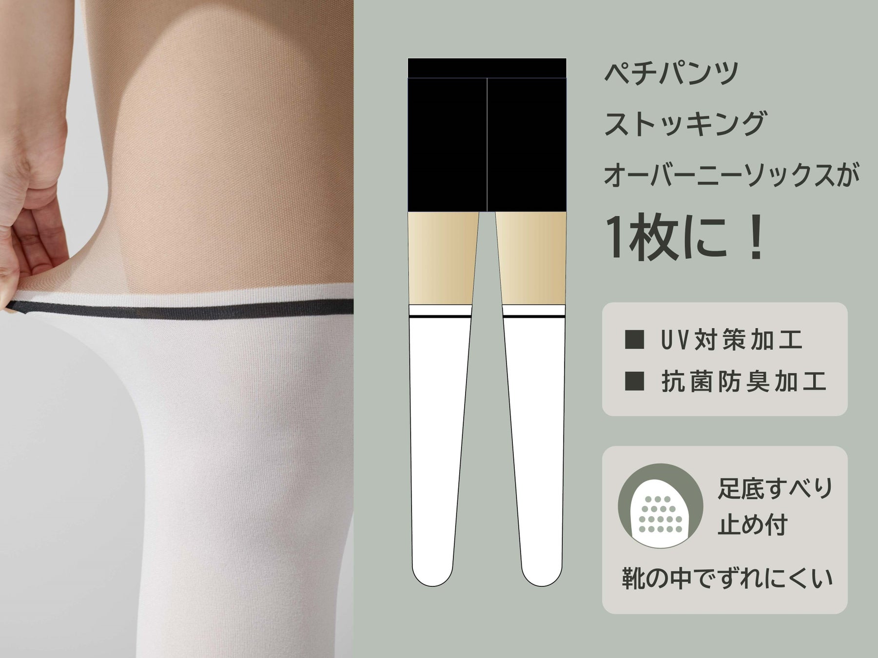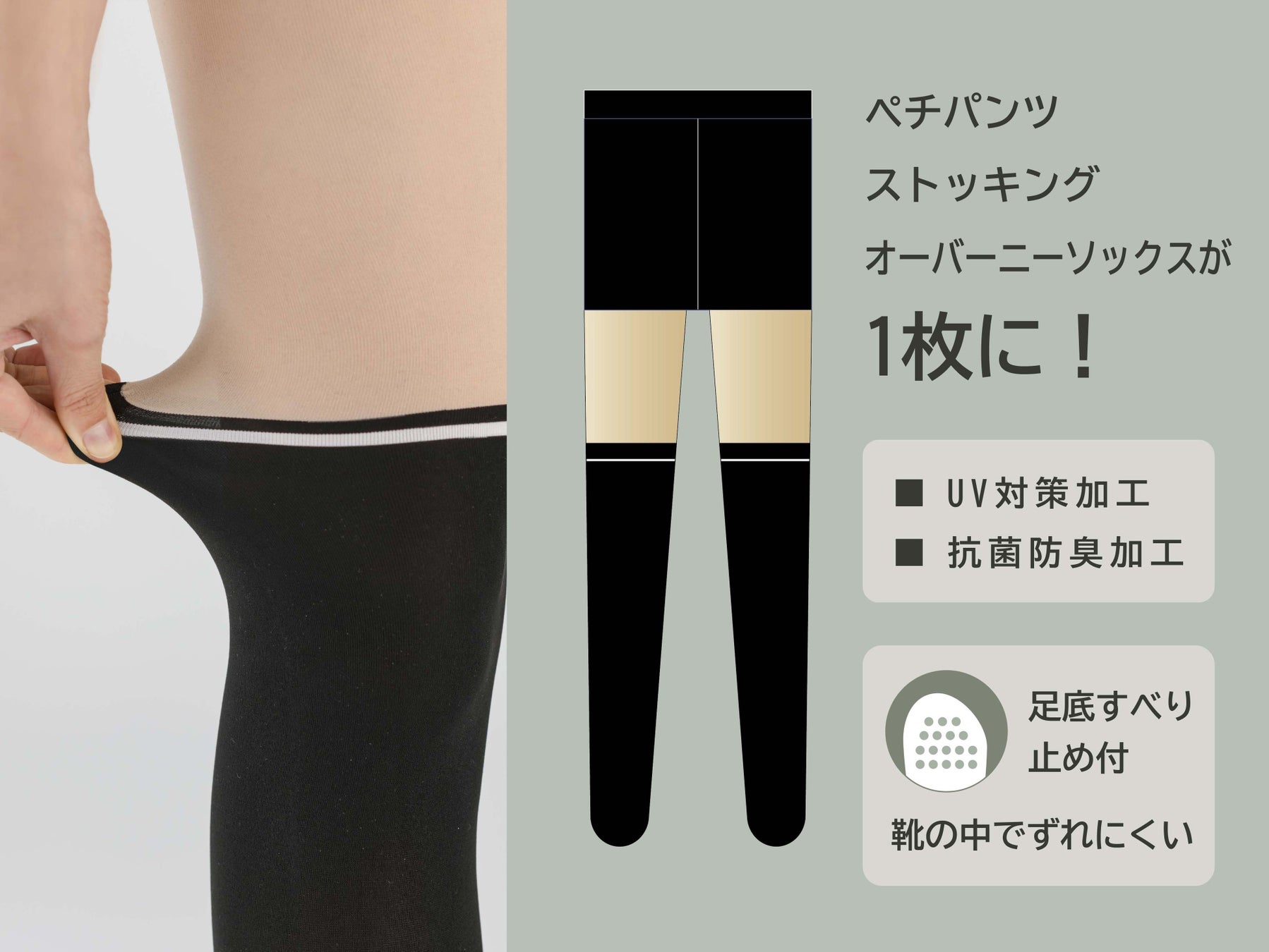 ペチパンツ、ストッキング、オーバーニーソックスの3つが一体となったアイテム。オーバーニー部分はナイロン素材です。ペチパンツの重ね履き不要でウエスト周りすっきり。オーバーニーのずり下がりを気にする必要もなく快適です。伝線しにくいメッシュ編み生地に、紫外線を低減するUV対策加工を施しています。更に抗菌防臭加工付きのため、ニオイが気になりにくく、つま先には靴の中でずれにくい足底すべり止め付きです。