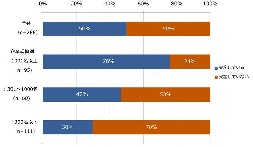 従業員のキャリア形成支援に関して、全体の半数が「実施している」(50%)と回答をしました。企業規模別では、1001名以上が「実施している」(76%)と最も多く、301~1000名の企業では(47%)、300名以下の企業は(30%)となり、企業規模により取り組み状況に差があります。