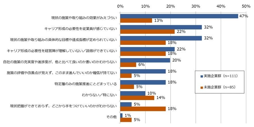 「キャリア形成支援」を検討・企画・推進する上での課題として、実施企業では「現状の施策や取り組みの効果がみえづらい」(47%)という回答が、約半数を占めています。「キャリア形成の必要性を従業員が感じていない」(32%)、「現状の施策や取り組みの具体的な目標や達成指標が定められていない」(32%)が続き、従業員へのキャリア形成に関する支援や情報発信に課題を感じていることがわかりました。