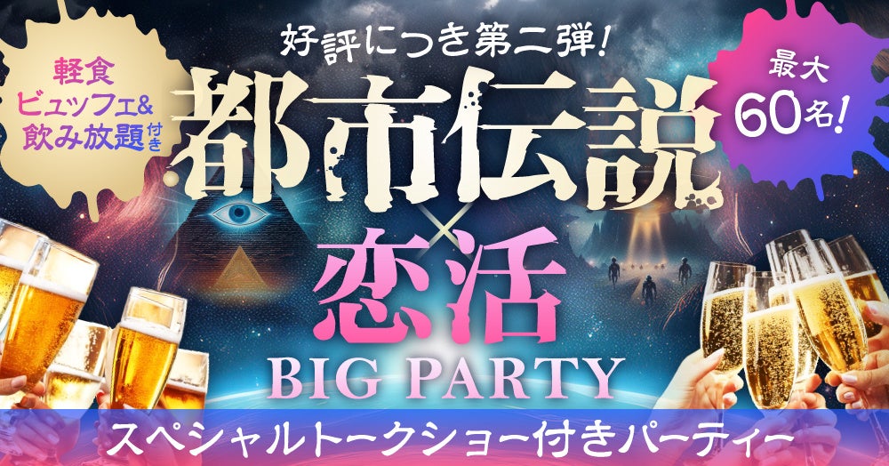 タイトル:【前回即完の大人気企画!最大60名規模!】都市伝説好き男女が集まる恋活party♡都市伝説にまつわるトークショーあり!【軽食ビュッフェ&飲み放題付】