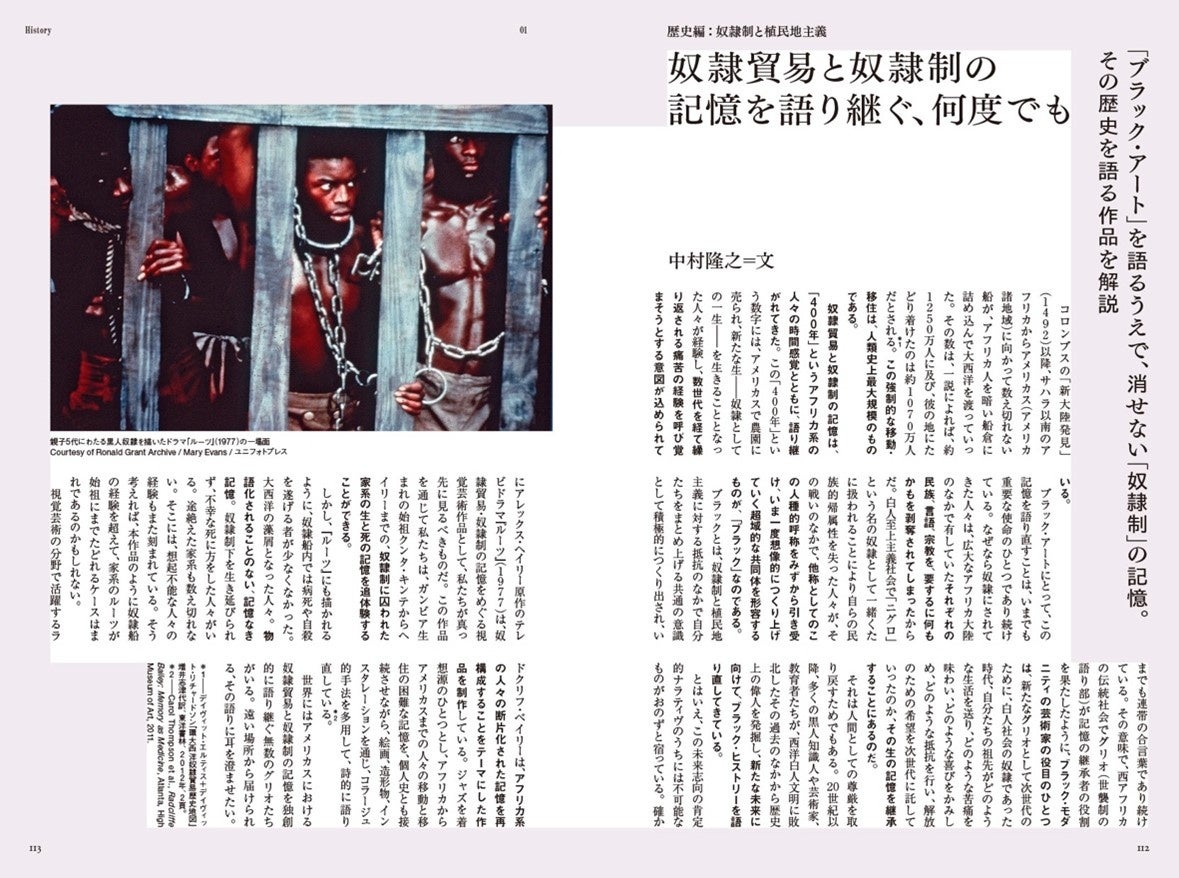 現在の「ブラック・アート」を語るうえで欠かすことのできない、植民地主義や美術界での「闘争」の歴史。このパートでは、その一端を知るために「奴隷制と植民地主義」「欧米での展覧会」「アーティスト」「言説と批評」「美術と政治」の5つのトピックから、歴史上に起きた出来事や事象に触れる。また、「ブラック・アート」の「名付け」の歴史やそれが及ぼした論争や影響についても、2つの論考で解説。その呼称がはらむ、排除と周縁化のメカニズムについて考える。