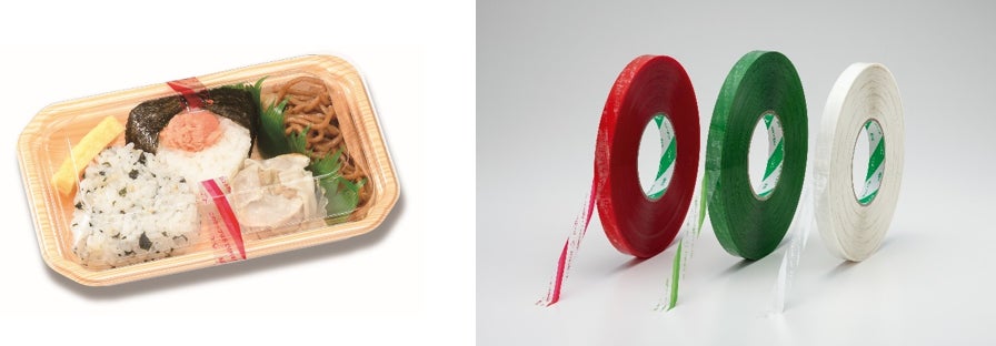 「フードパックテープ(TM)」は、手で切ることができる食品容器の簡易包装用テープです。テープの主原料は天然素材で、基材にセロハン、粘着剤に天然ゴムを使用した環境配慮製品です。お弁当、お惣菜などの食品容器のふた固定用、液体調味料などの食品容器への添付固定用として、スーパーマーケットやお弁当・惣菜販売店などで幅広くご使用いただいています。