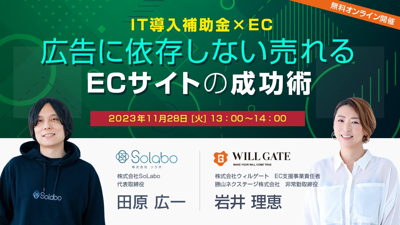 ウィルゲート、11月28日にSoLabo社と《【IT導入補助金×EC】広告に依存しない売れるECサイトの成功術》をテーマにオンラインセミナーを開催
