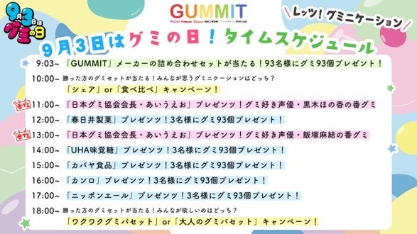 また、事前企画として本日8月22日(月)から9月2日(金)まで毎日Twitter上で参加型の企画を行い、8月24日(水)にはUHA味覚糖協賛のTwitter事前投票企画も実施します。そして、その事前投票結果をもとに9月3日(土)当日14時からグミ93個を3名にプレゼントするなどしてグミの日をGUMMITメーカーとして盛り上げていきます。