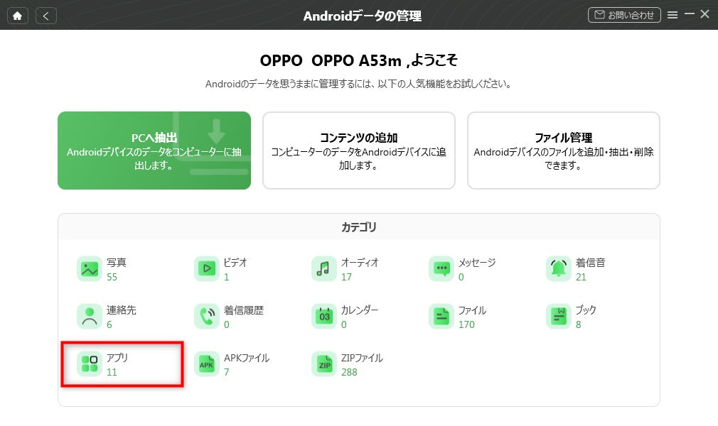4. カテゴリ一覧が表示されるので、取り出したい「アプリ」や「APKファイル」を選択します。