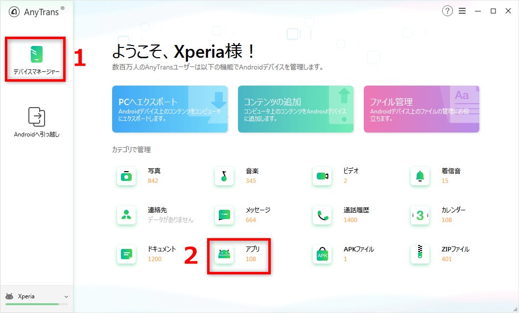 AnyDroidを使って、Androidからパソコンにアプリだけでなく、写真、音楽、動画、連絡先、メッセージ、通話履歴などのデータを取り出すことができます。また、パソコンからAndroidにデータを転送することもできます。