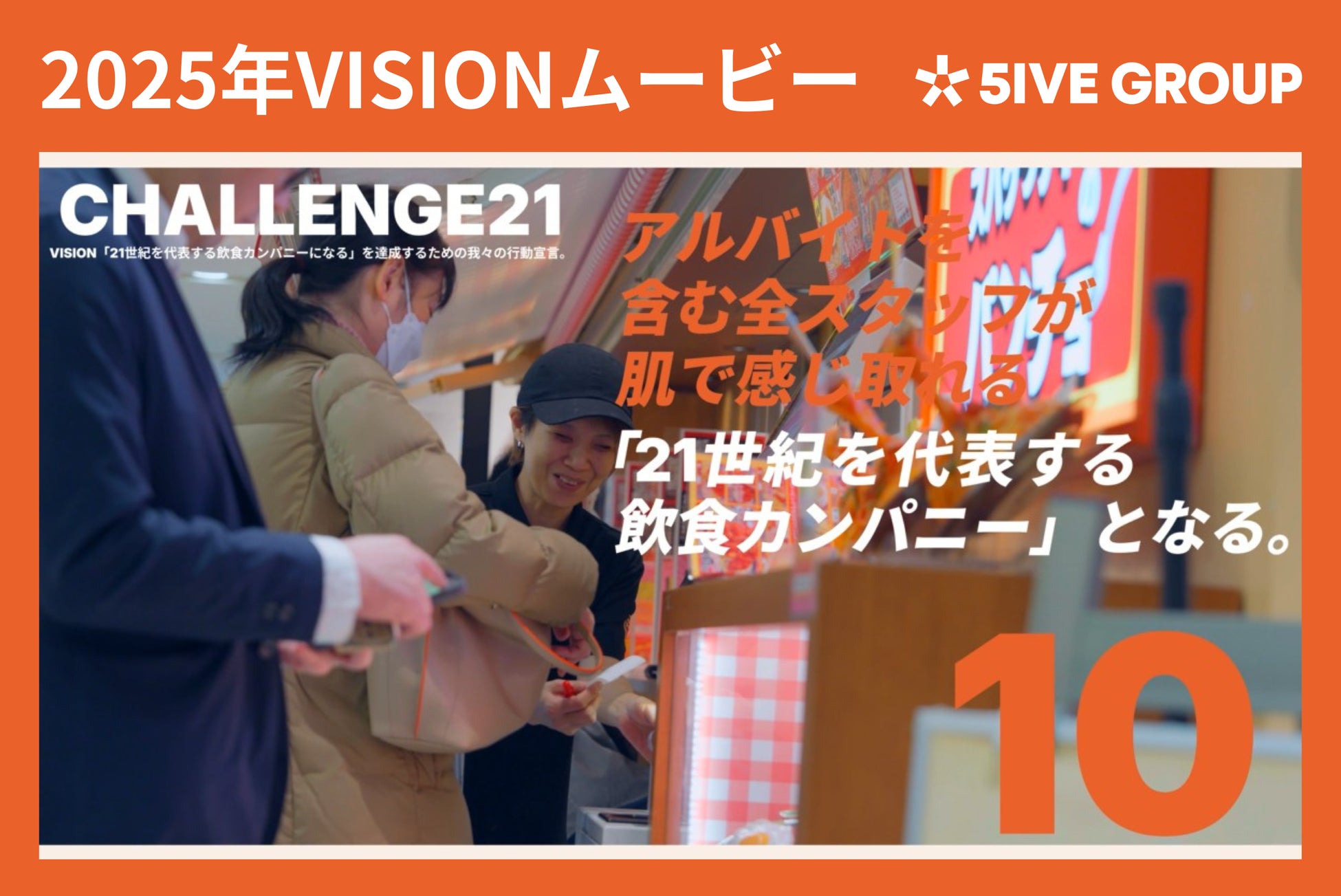 株式会社ファイブグループのビジョン「21世紀を代表する飲食カンパニーとなる」を達成するための行動宣言として「CHALLENGE21(チャレンジ21)」を2025年1月から改定いたしました。