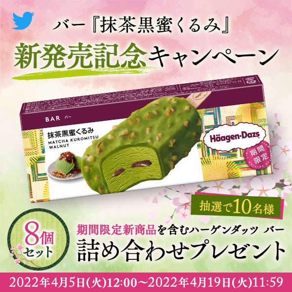 バー『抹茶黒蜜くるみ』の発売を記念して、Twitterで10名様に新商品を含むハーゲンダッツ バー8個詰め合わせセットが当たるキャンペーンを実施します。
