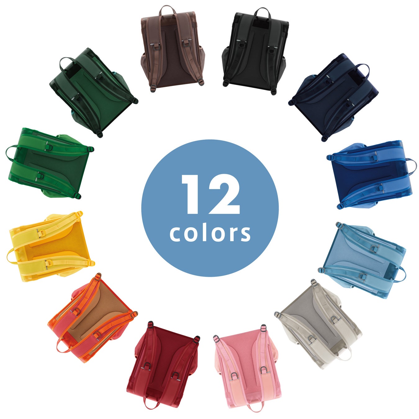 ①ランドセルの重量化による子どもの体への負担軽減のため、ナイロン素材と人工皮革を融合し軽量化を実現。 ②ジェンダーレスな提案として、男女問わず好きな色を選べるような12色の豊富なカラー展開。