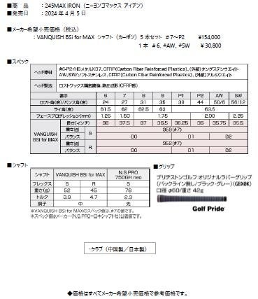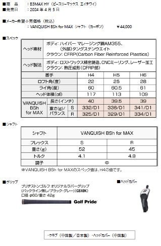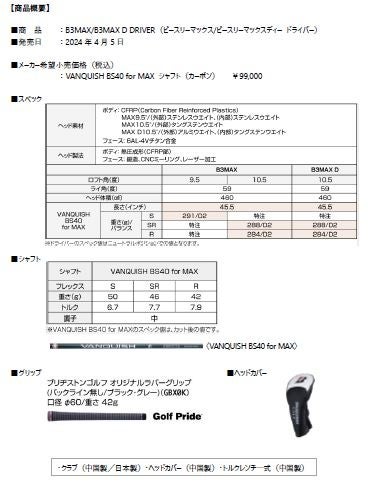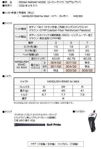 メーカー希望小売価格※3は、『B3MAX DRIVER』(ビースリーマックス)、『B3MAX D DRIVER』(ビースリーマックス ディー)ともに99,000円(当社オリジナルVANQUISH BS40 for MAXシャフト仕様)、『B3MAX FAIRWAY WOOD』が、60,500円(当社オリジナルVANQUISH BS40 for MAXシャフト仕様)、『B3MAX HY』が、44,000円(当社オリジナルVANQUISH BSh for MAXシャフト仕様)、『245MAX IRON』が、5本セット(#7~P2)で154,000円(当社オリジナルVANQUISH BSi for MAXシャフト仕様)、単品(#6,#AW,#SW)1本30,800円にて発売します。