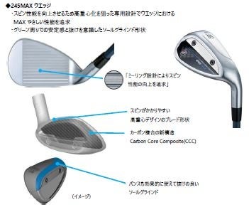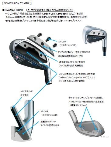 『245MAXアイアン』は、フェースの裏面にカーボンを複合した新構造Carbon Core Composite(カーボンコア コンポジット)により、フェースを1.85mmまで薄肉化。カーボン複合構造による軽量化で生み出された30g超の高機能プレートを搭載し寛容性の高い飛びを追求したイノベイティブアイアンです。