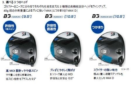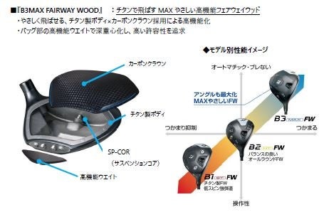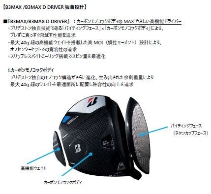 『B3MAXシリーズ』は、シンプルに構えやすいシェイプと機能美を実現しつつ、「接点の科学」から生みだされた、インパクト時のボールの滑りを極限まで抑え、理想的なスピンで飛ばす独自のフェーステクノロジー「バイティングフェース」と、クラブヘッドを高機能化させる画期的な独自構造である「カーボンモノコックボディ」を搭載し、直進性が極めて高い理想的な弾道を追求したモデルです。「カーボンモノコックボディ」による軽量化で生み出された40g超の余剰重量をロフト別、モデル別に最適配分することによってゴルフファーのニーズに合わせた機能に特化させた設計に進化しています。