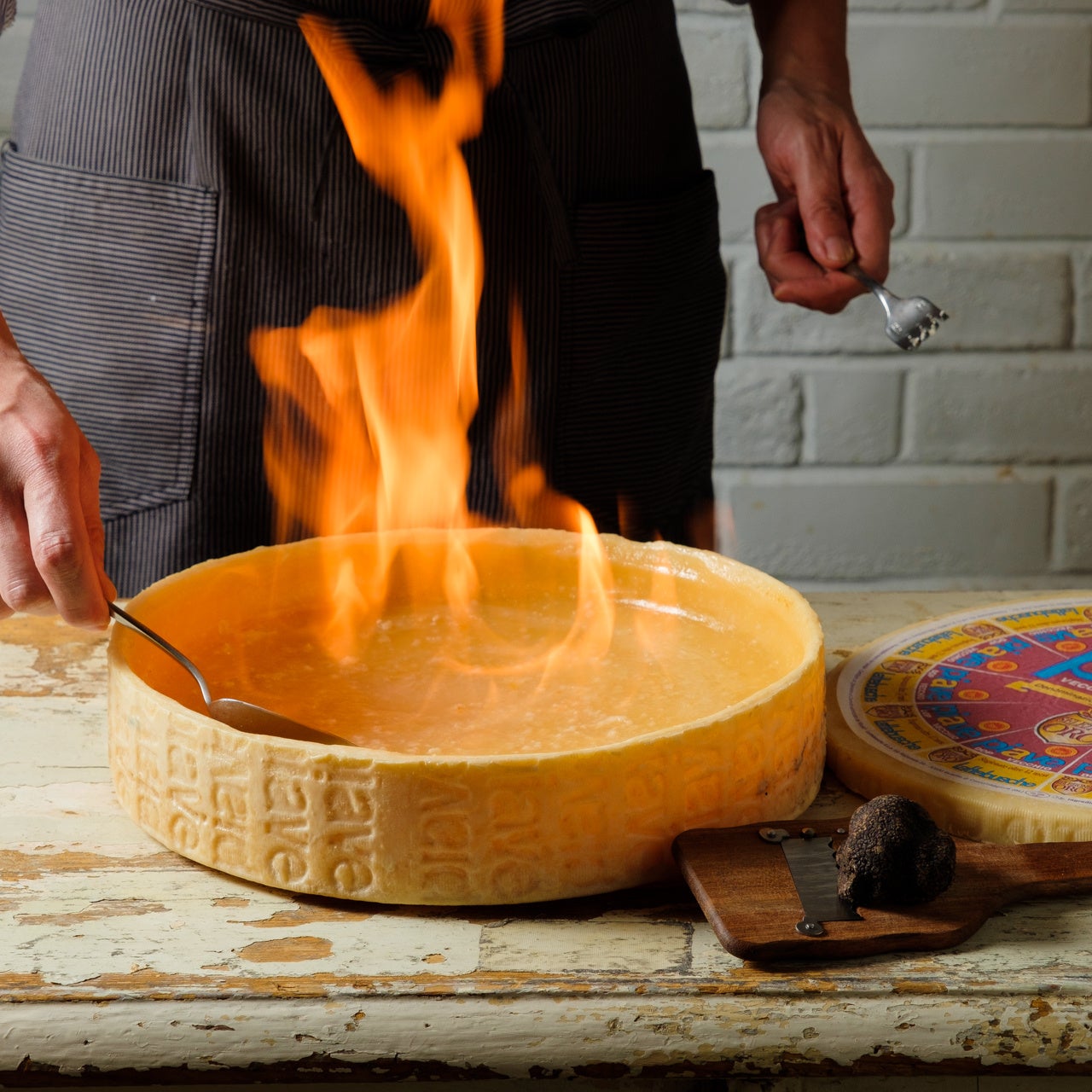 長期熟成のイタリア産ピアーヴェチーズの塊にスピリタスを使いフランベし、チーズを溶かします。
