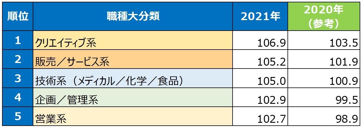 職種大分類は職種を大きな分類で括ったカテゴリを指します。2021年の決定年収上昇率をみると、11のうち8つの職種大分類で、コロナ前である2019年の決定年収を上回りました。(【表1】【表2】)