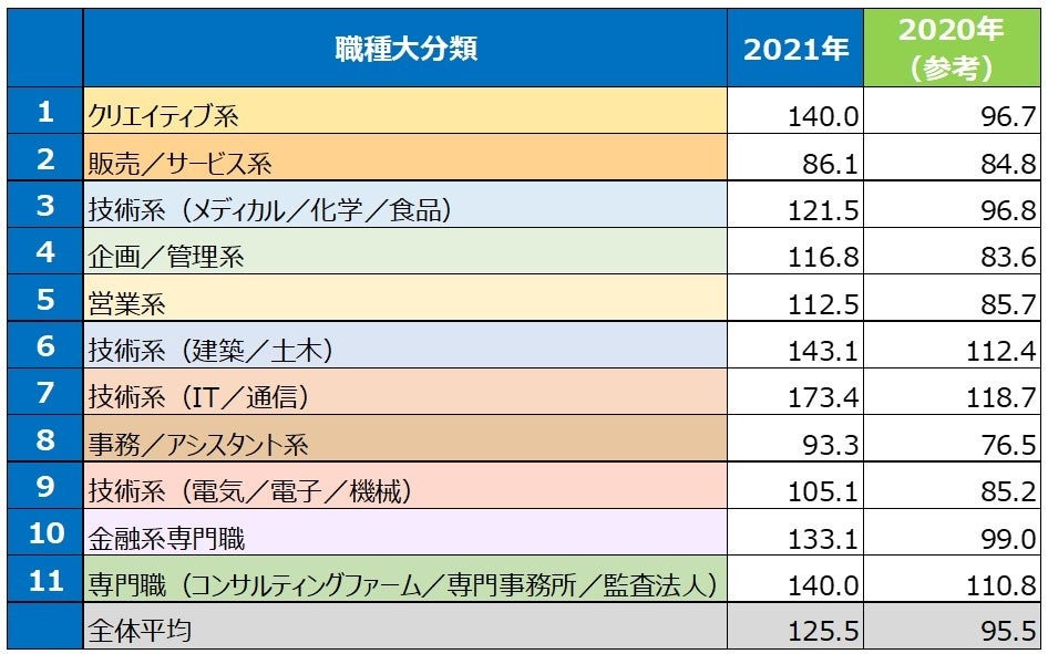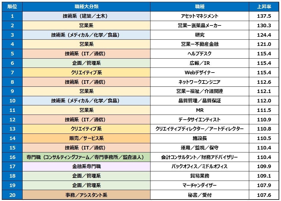 続いて、細かな職種に分けた職種別での上昇率ランキングをみると、「技術系(建築/土木)」や「営業系」、「技術系(メディカル/化学/食品)」などの大分類に入る職種で大きな伸びが見られました。(【表4】)