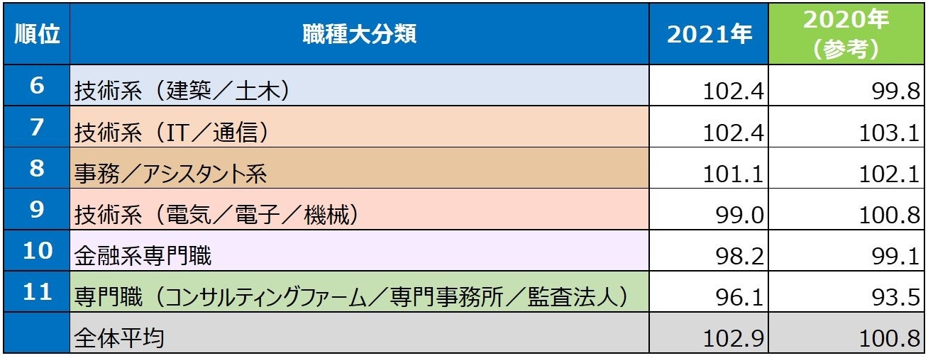 【表2】 職種大分類別 決定年収の上昇率ランキングTOP6~10 ※2019年を100とした場合の推移