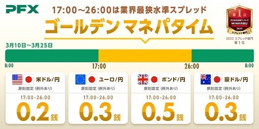 株式会社 マネーパートナーズ(代表取締役社長:福島秀治、本社:東京都港区、以下「当社」)は、3月10日より17時~26時を『ゴールデン マネパタイム』とし、業界最狭水準スプレッドを提示するキャンペーンを実施いたします。