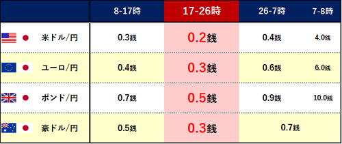 ※主要経済指標発表時等の急変時、国内外の休日や平日早朝など著しい流動性低下時はやむをえずスプレッドを拡大する場合がございます。