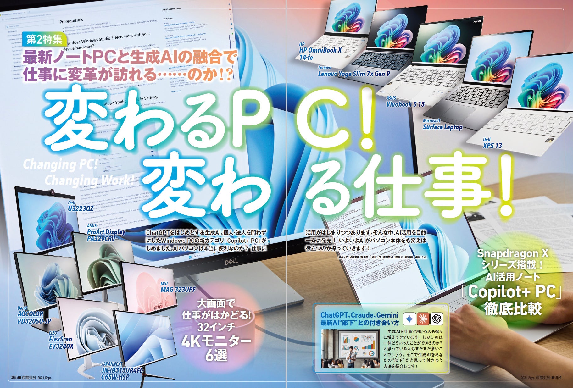 ChatGPTをはじめとする生成AI。個人・法人を問わず活用がはじまりつつあります。そんな中、AI活用を目的にしたWindows PCの新カテゴリ「Copilot+ PC」が一斉に発売! いよいよAIがパソコン本体をも変えはじめました。AIパソコンは本当に便利なのか? 仕事に役立つのか探っていきます!