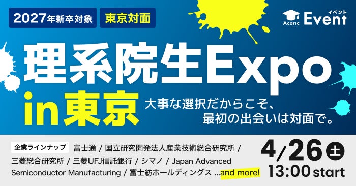 大学院生をはじめとする高度専門人材のキャリア支援・採用支援を行うアカリクは、修士・博士課程の理系大学院生を対象とした対面型合同説明会「理系院生Expo in 東京」を、2025年4月26日(土)に開催します。
