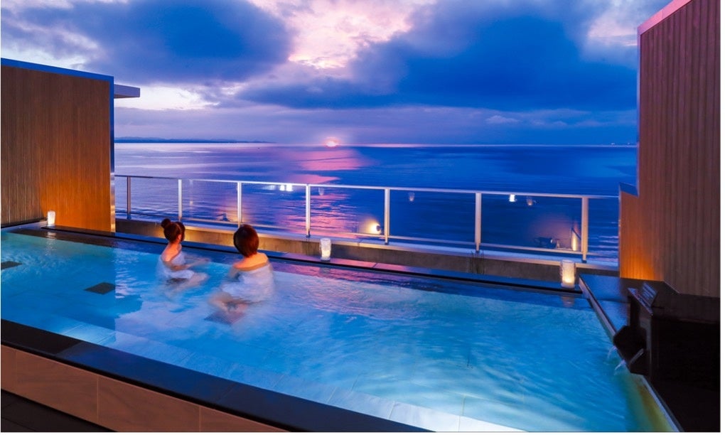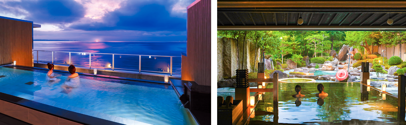 左:海派にお薦め。別府湾に昇る朝日を眺めながら温泉を楽しめる「別府清風(大分県)」の絶景露天風呂