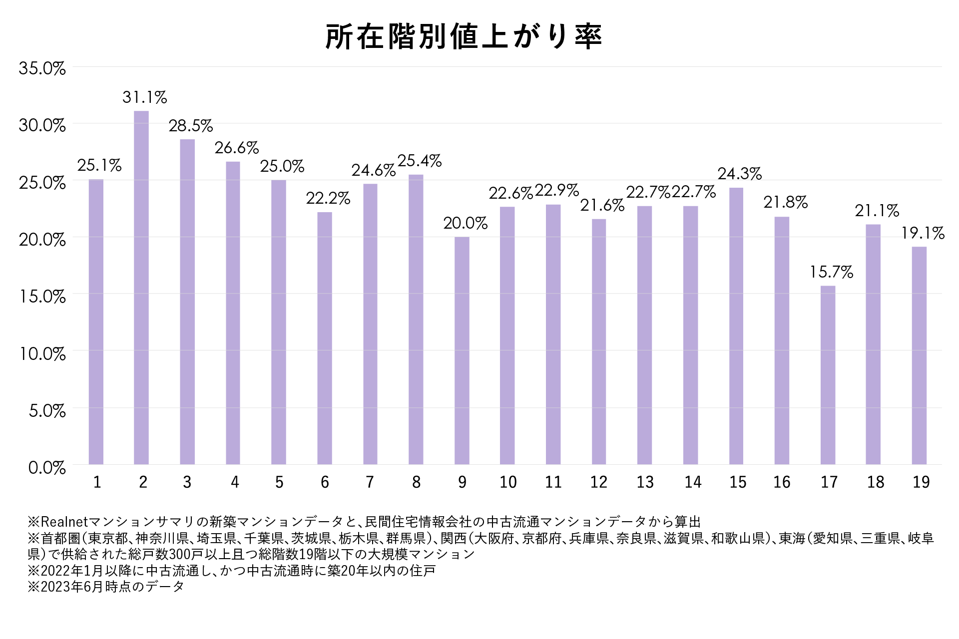 徒歩分数や面積帯毎の比較と比べると階数による差は少ないものの、低層階(2階~4階)が全階数の中でも値下がりしづらい(より値上がりしている)傾向にあります。