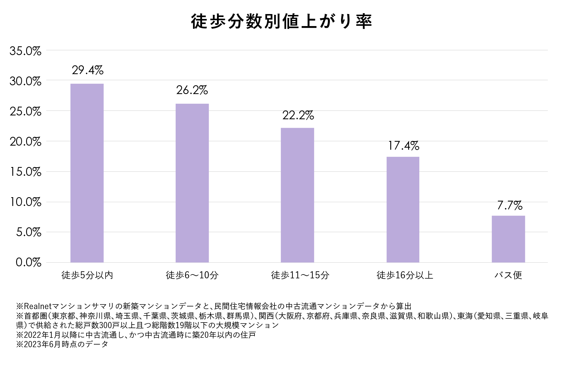 駅からの徒歩分数ごとに、徒歩5分以内、徒歩6~10分、徒歩11~15分、徒歩16分以上、バス便の区分で値上がり率を見てみると、駅から近い方から遠い方に向かって下がっているのが分かります。よく「駅近神話」などと言われますが、傾向としては間違ってはいないようです。
