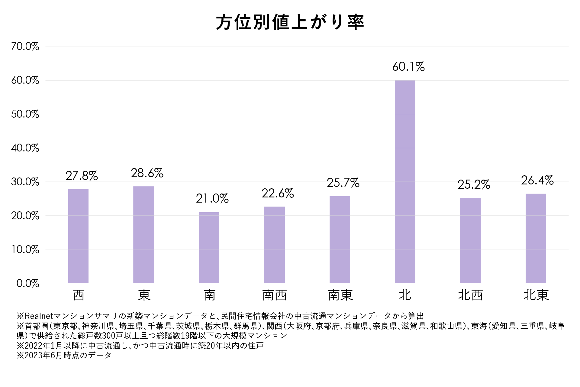 最後に方位別の値上がり率を見てみると、意外にも北向きの値上がり率が最も高く、南向き、南東向き、真南向きの値上がり率が全方位の中でも低いという結果になりました。