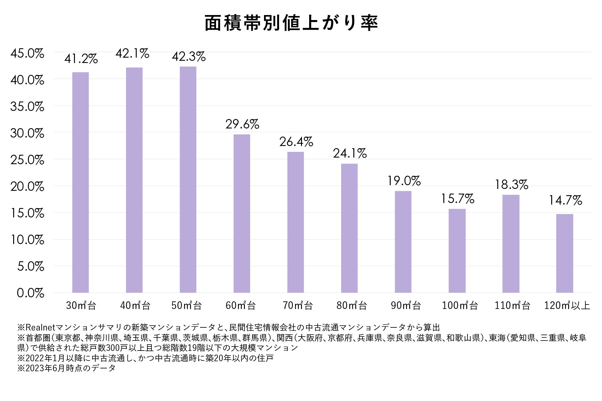 まずは、住戸の面積帯ごとの値上がり率を見てみます。