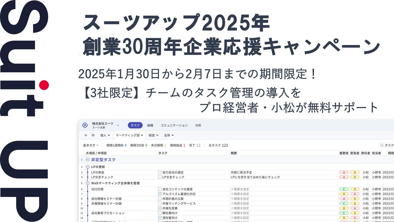 2025年1月30日から2月7日までの期間に、スーツアップの無料お試し30日にお申込みいただきました、2025年に創業30周年を迎える企業うち3社限定で、当社代表者であり中小・中堅企業やスタートアップのバリューアップに実績のあるプロ経営者の小松自ら、チームのタスク管理の導入サポートを無料で行うキャンペーンを実施します。