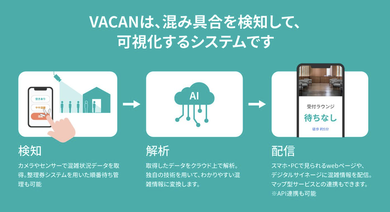 バカンは経済産業省が選定する官民による支援プログラムJ-Startup 2019選定企業です。IoT、AIを活用してあらゆる空き情報を収集し提供。レストラン街やカフェ、トイレ、観光地、避難所、投票所などあらゆる場所の空き状況をセンサーやカメラなどで検知し、デジタルサイネージやスマートフォンに配信するサービスを提供しています。また可視化だけでなく混雑の抑制・管理なども行っており、空き情報を起点としたDXサービスを提供しています。