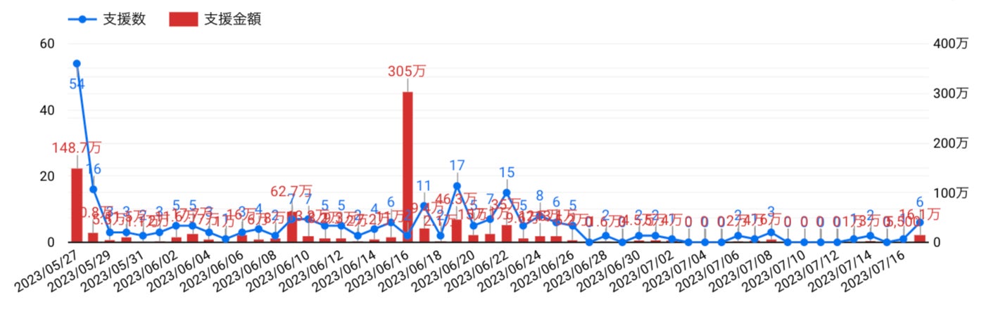▼⽀援募集期間を通じた⽀援数および⽀援⾦額