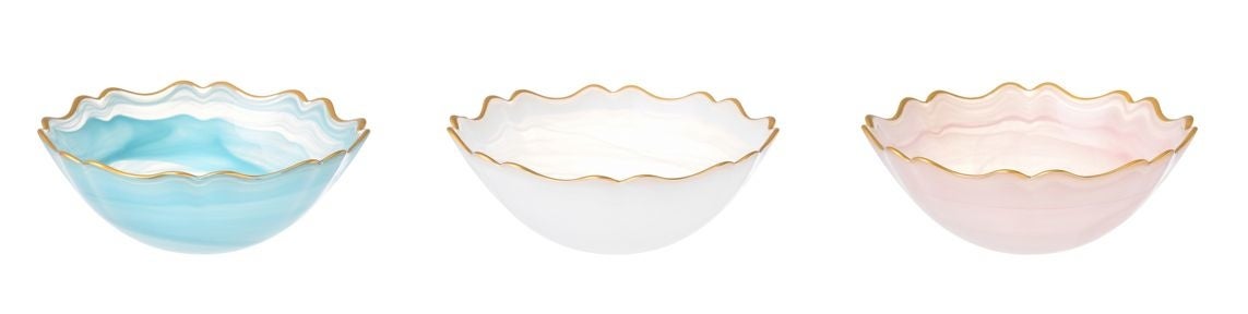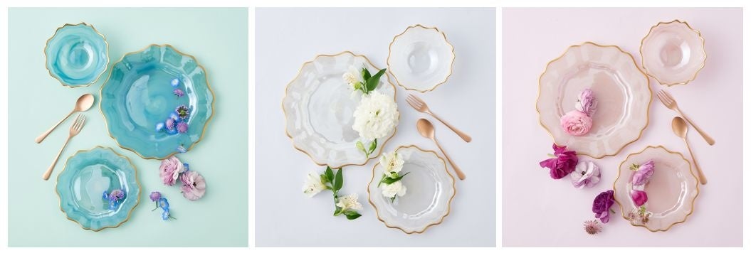- オパール加工とマーブル模様が魅力的なフラワーモチーフのガラスウェアが新登場