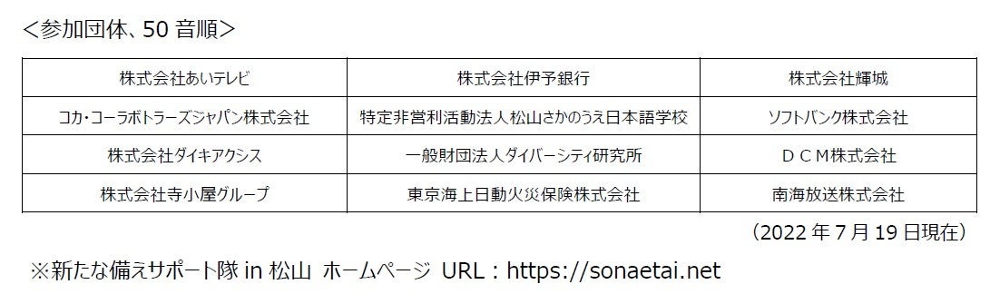 このたび、愛媛県松山市で事業展開する企業等の有志12社は、地域の防災力を強化することを目的に、「新たな備えサポート隊in松山」実行委員会(発起人:DCM株式会社 取締役 中川真行)を立ち上げ、2022年7月25日(月)に愛媛県松山市(市長:野志克仁)、愛媛大学防災情報研究センター(センター長:バンダリ・ネトラ・プラカシュ)と事業協定を締結します。