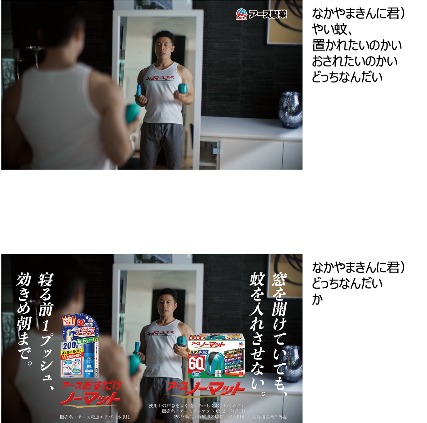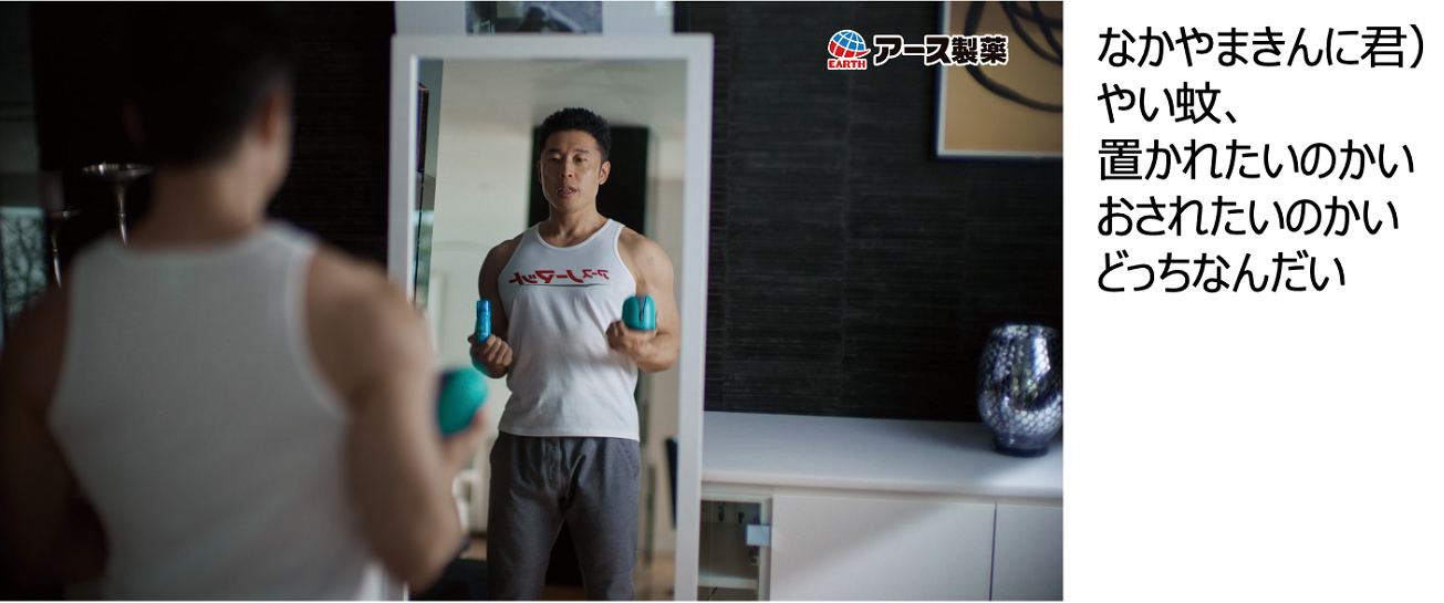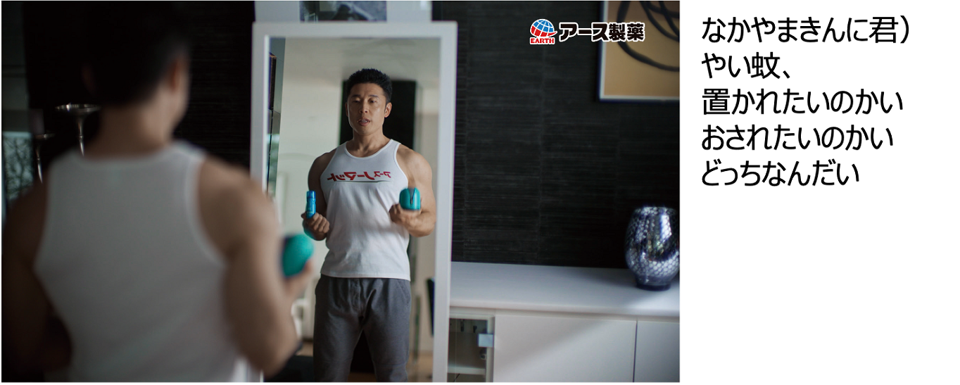 鏡に向かってアースノーマット/おすだけノーマットを手にするきんに君。おなじみのギャグ“筋肉ルーレット”で「置かれたいのかい!押されたいのかい!どっちなんだい!」と蚊に語りかけます。