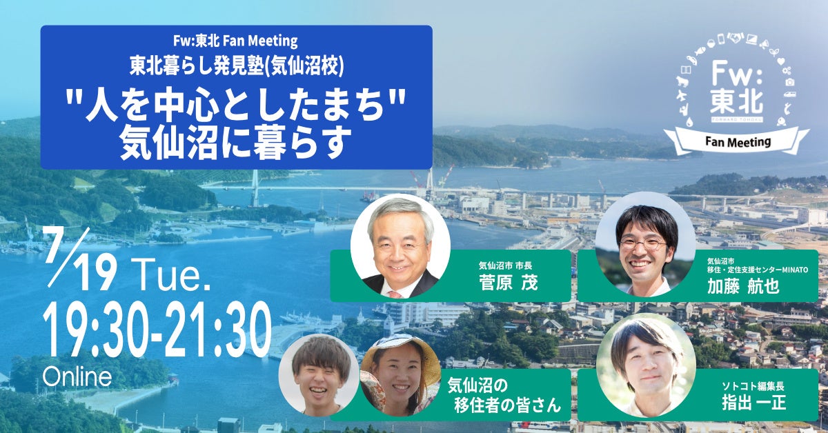 Fw:東北Fan Meetingでは、岩手・宮城・福島の3県で地域課題の解決に取り組む人々と、首都圏および全国の人々をつなぎ、東日本大震災の被災地の復興・創生の好事例となる知見の共有や、地域間の交流および持続的な関係構築を生むためのワークショップを、前身となる「Fw:東北 Weekly」から継続して行ってきました。今回のワークショップでは、気仙沼市への移住環境について取り上げられます。