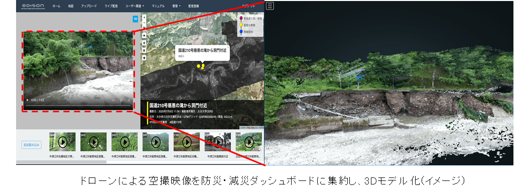 ドローンにより取得された現場映像について、災害対策本部で3Dモデル解析を行い、高精度の測量情報等をタイムリーに確認することで、災害対策初動判断の材料に活用。