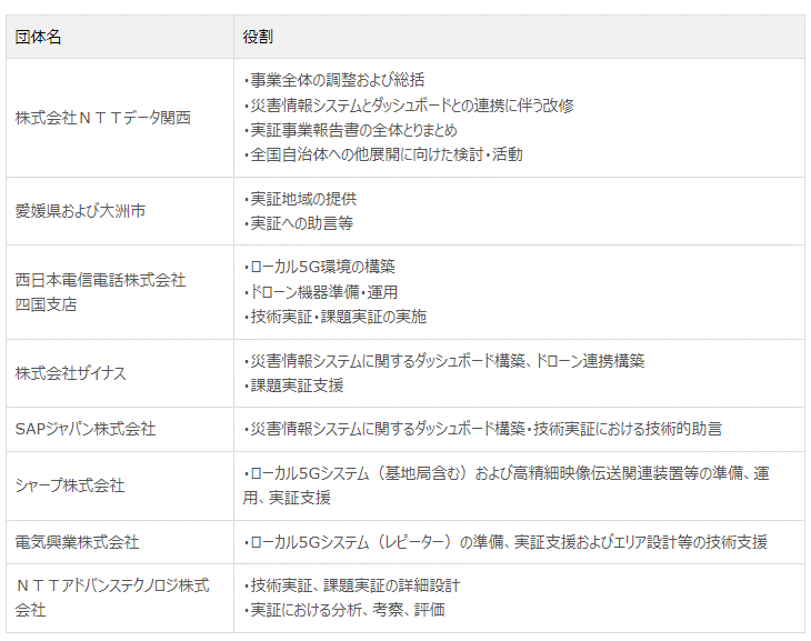 株式会社NTTデータ関西(以下、NTTデータ関西)、愛媛県、西日本電信電話株式会社四国支店、株式会社ザイナス、SAPジャパン株式会社、シャープ株式会社、電気興業株式会社、NTTアドバンステクノロジ株式会社は、総務省「令和4年度課題解決型ローカル5G 等の実現に向けた開発実証」の公募に対し、「高精度映像伝送による災害時の迅速な情報共有・意思決定の実現」を目的とした提案を行い採択されました。