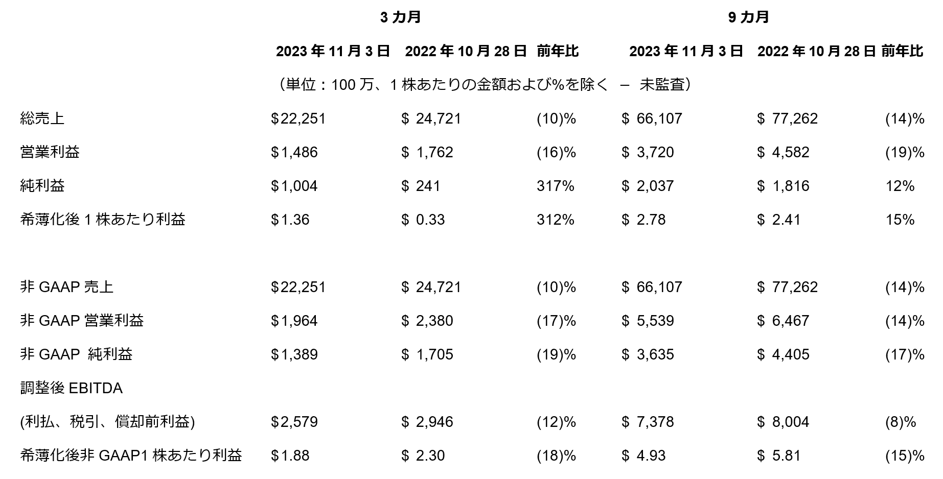デル・テクノロジーズは、当会計年度(2023年2月~2024年1月)の第3四半期(2023年8月~2023年10月)の業績を発表しました。第3四半期の売上高は前年同期比10%減の223億ドル、営業利益は前年同期比16%減の15億ドル、非GAAPベースの営業利益は同17%減の20億ドルでした。希薄化後1株あたり利益は1.36ドル、非GAAPベースの希薄化後1株あたり利益は1.88ドルでした。収益性と運転資本の改善が牽引し、第3四半期の営業キャッシュフローは22億ドルでした。過去12カ月を通じた営業キャッシュフローは99億ドルでした。